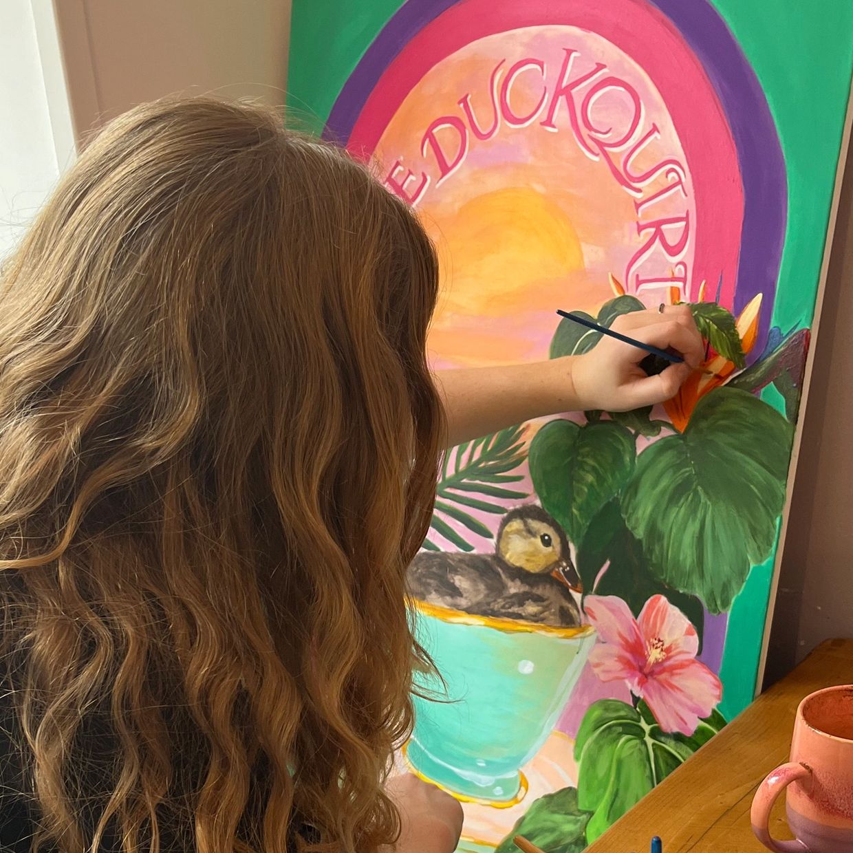 Our duck-themed branding and artwork is provided by local artist, Jordanne Wood. Jordanne takes care of our website, posters, menus, socials & the artwork on our walls including 'the Duckquiri' visible through our front window and 'Duck-jeeling' in our main tearoom area - the duckling that inspired our logo!